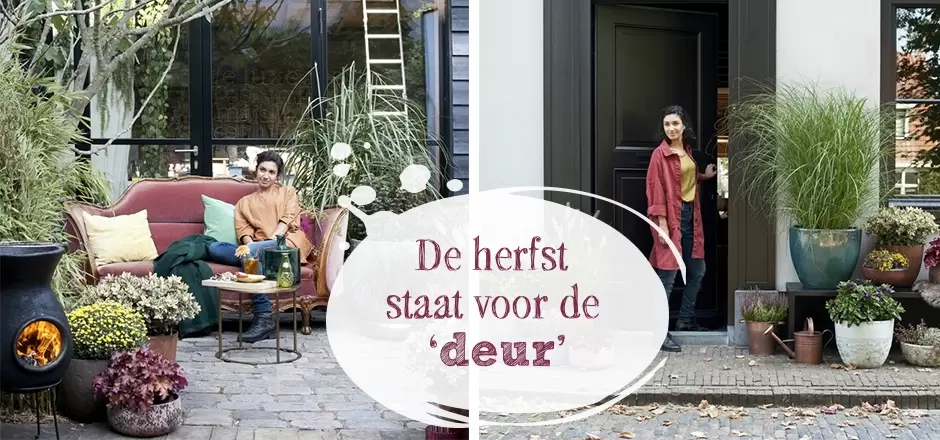 Pak die sjaal maar uit de kast. En vergeet de extra aankleding voor de voordeur niet! Wat? Zoals jij je garderobe aanpast aan het seizoen, zo kun je het exterieur van je woning ook ‘ver-herfsten’. De herfst staat voor de deur, dus verwelkom het nieuwe seizoen al bij je entree. Maak een herfstkrans met de voordeur als chique omlijsting en creëer een mooi samenzijn van planten en potten voor een verpletterende eerste indruk. Met typische herfstplanten geef je kleur, vorm en stijl aan je persoonlijke buitenplek. Of dat nu een patio, voordeur of tuin is!
